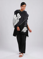 An artful dance of bold ivory florals against a pristine black canvas. Draped or wrapped, it transforms any look into one of undeniable sophistication, embodying modern chic with a touch of couture flair.