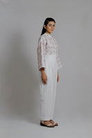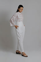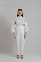 Kimono sleeve front open jumpsuit, embellished with pearls.