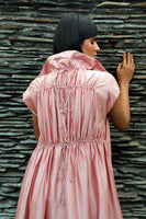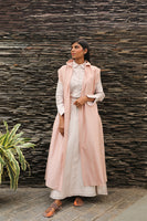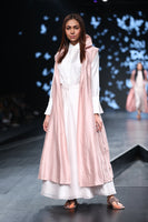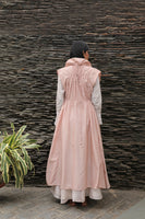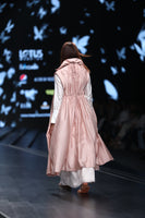 Long multi-panel flared overlay with adjustable Doris(cords) at the back with Shirt with open french cuffs and Multi-panel skirt with side pockets.
