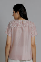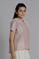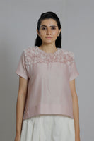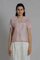 Chanderi silk woven tee embellished with silk yarns and pearls.